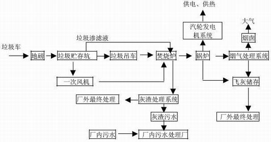 垃圾经简单的粉碎、磁选后,用行车抓斗将垃圾抓入输送皮带,然后经输送皮带进入除氧间垃圾进料斗,给料机将斗内垃圾送入炉膛焚烧。经过干燥、燃烧、燃烬三个阶段充分燃烧。垃圾燃烧后产生的大量高温烟气进入余热锅炉换热,过热蒸气进入汽轮发电机组发电。